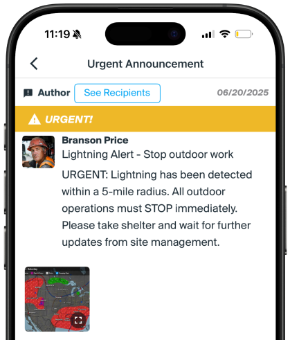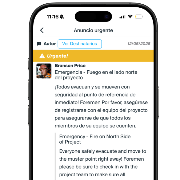 The moment jobsite conditions change, alerts reach every worker instantly. Messages are delivered straight to their phones, with automatic English-to-Spanish translation. No email required.